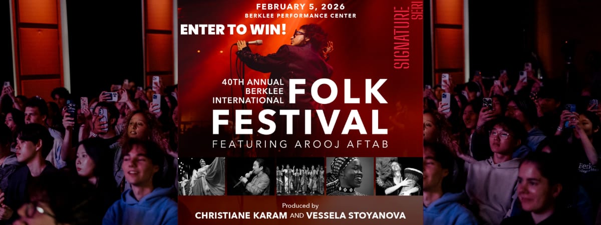 40 years of global sounds, one unforgettable night. The Berklee International Folk Festival returns on February 5th with a stacked lineup featuring Grammy winner Arooj Aftab, the Pletenitsa Balkan Choir and artists from around the world. We’ve got your chance at FREE SEATS for this milestone celebration!*